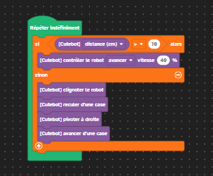 Plus bas donc voici le code, et grâce à ce programme plus précisement grâce au bloc"[Cutebot]ditance(cm)" qui si son capteur capte un obsctale à moins de 10cm alors la voiture éxecute le programmme qui se trouve dans le bloc"sinon",soit,reculer,faire un 90° vers la droite et clignoter: