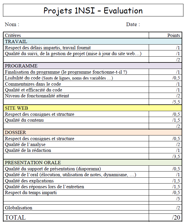 Les projets sont notés et cette note comptera pour le troisième trimestre. L’évaluation se fonde sur l’examen du site web, du suivi du projet, du dossier, du programme et de l’oral. Les critères d’évaluation (sujets à ajustement) sont donnés à la fin de ce document en annexe.